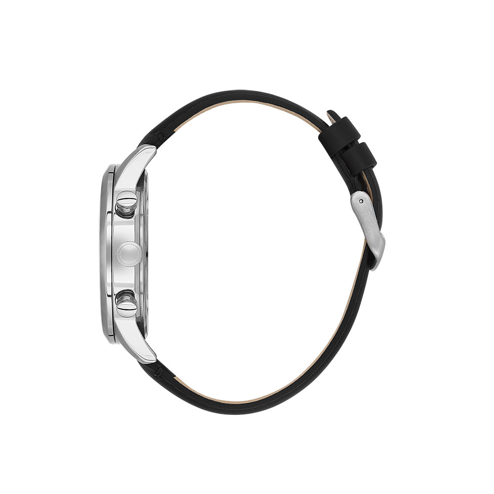 Designul elegant este completat de o curea din piele neagra si o carcasa rotunda din aliaj metalic argintiu, ce masoara 44 mm in diametru. Geamul din cristal mineral protejeaza un cadran negru, clar si usor de citit, dotat cu functii de cronometru si afisare a datei. Rezistenta la apa de pana la 5 atm face acest ceas potrivit pentru uz zilnic, fiind capabil sa reziste la stropiri accidentale sau ploaie.