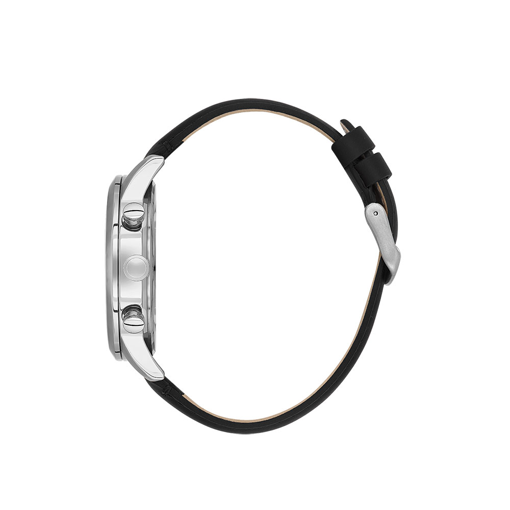 Designul sau casual, cu carcasa rotunda din aliaj metalic argintiu si cadranul bleumarin, este accentuat de o curea eleganta din piele neagra, ce se inchide confortabil cu o catarama. Rezistenta la apa de 5 atm face acest ceas potrivit pentru uz zilnic, inclusiv in conditii de umiditate.