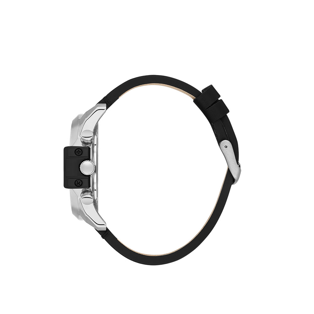Designul sofisticat include un cadran negru elegant, protejat de un cristal mineral durabil, si o carcasa argintie din aliaj metalic, care ofera un contrast vizual impresionant. Curea de piele neagra, ajustabila cu catarama, adauga un nivel suplimentar de confort si stil, facandu-l perfect pentru orice ocazie, de la intalniri de afaceri la evenimente sociale.