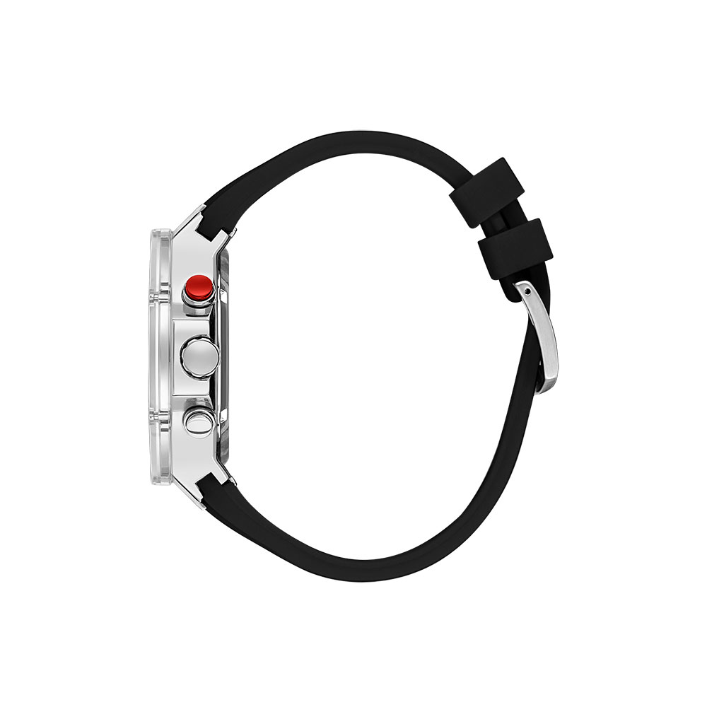 Cadranul negru cu accente gri si albe ofera o vizibilitate excelenta, iar cele trei subcadrane adauga un plus de complexitate si eleganta. Cureaua din silicon negru de 28 mm latime si 215 mm lungime, prevazuta cu sistem de inchidere tip catarama, asigura confortul pe durata intregii zile.