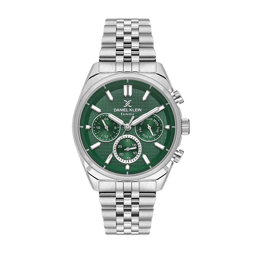 Carcasa rotunda din aliaj metalic argintiu are un diametru de 42 mm si o grosime de 12 mm, oferind o prezenta solida, dar confortabila pe incheietura. Cadranul verde intens, cu textura subtila si marcaje argintii, adauga un contrast rafinat si o nota distinctiva.