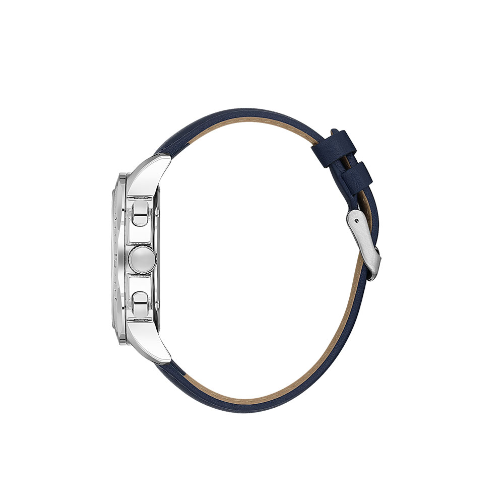Cu un cadran bleumarin texturat si indicatoare argintii luminescente, acest ceas se remarca printr-un aspect sofisticat si lizibilitate optima. Carcasa rotunda, cu diametrul de 45 mm, este realizata din aliaj metalic argintiu, completata armonios de o curea din piele bleumarin, moale si rezistenta, cu sistem de inchidere prin catarama clasica.