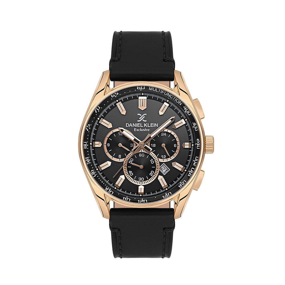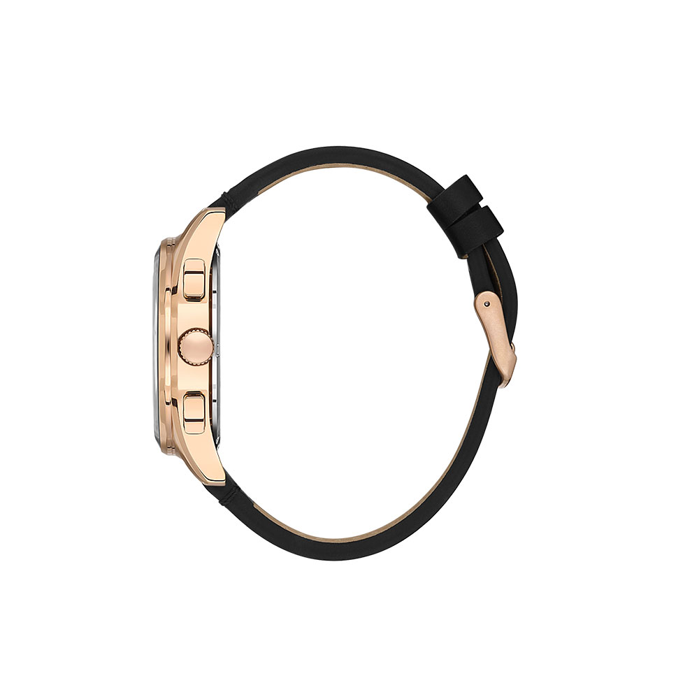 Carcasa rotunda, cu diametrul de 44 mm si grosimea de 13 mm, este realizata din aliaj metalic durabil si are un finisaj auriu rose ce adauga un plus de rafinament. Cadranul negru este completat de indicatoare si subcadrane in tonuri auriu rose, oferind un contrast elegant si o lizibilitate excelenta.