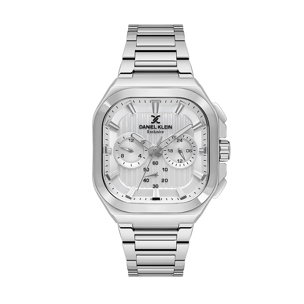 Cu o carcasa dreptunghiulara de 43 mm latime si 12 mm grosime, realizata din aliaj metalic argintiu, ceasul ofera un aspect robust si rafinat. Cadranul alb-argintiu, protejat de un cristal mineral rezistent, gazduieste un afisaj analogic cu multiple subcadrane functionale, inclusiv cronometru si afisaj 12/24 ore.