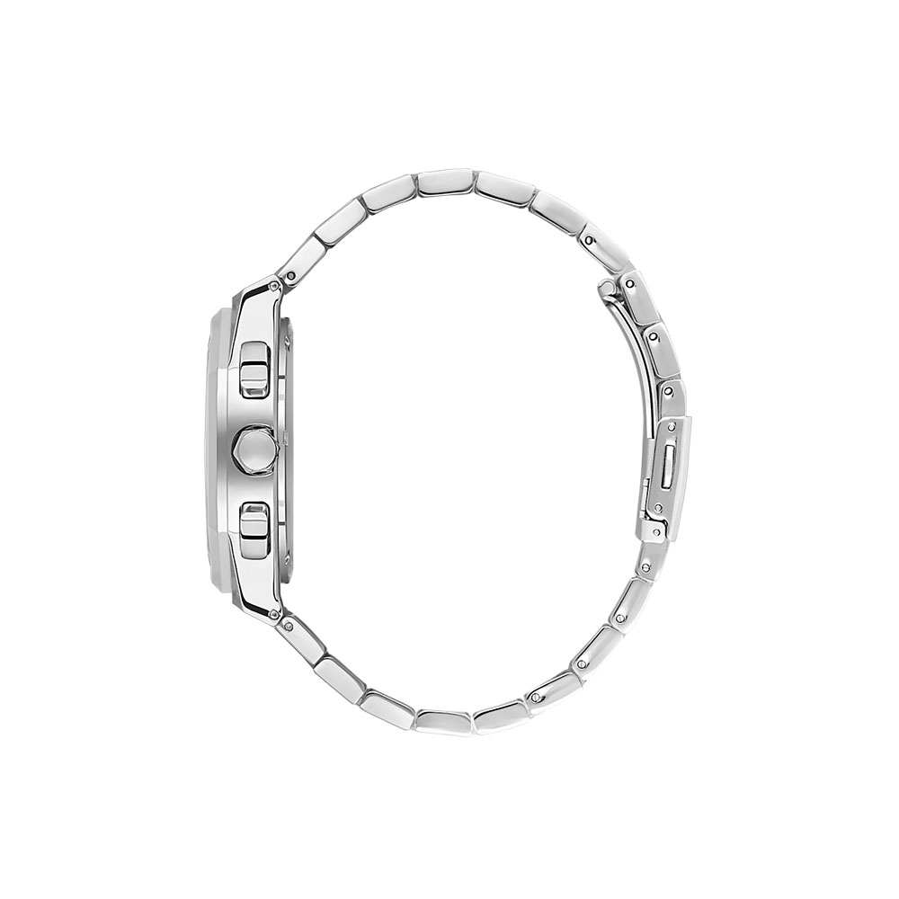 Carcasa ovala din aliaj metalic cu finisaj argintiu ofera un aspect impunator, completat de bratara robusta din otel inoxidabil in aceeasi nuanta. Cadranul negru cu texturi discrete adauga profunzime vizuala si gazduieste subcadrane functionale pentru cronometru, afisaj data si format ora 12/24.
