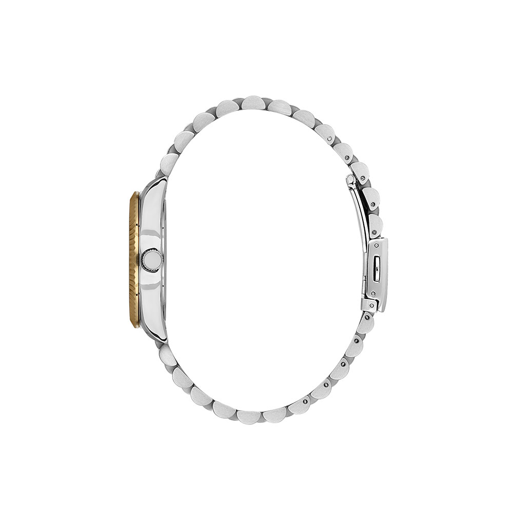 Bratara robusta din otel inoxidabil bicolor, in nuante de auriu si argintiu, se inchide sigur si elegant printr-un sistem tip fluture, oferind confort si siguranta pe durata purtarii. Mecanismul japonez Quartz Epson VX3JE1 garanteaza precizia, cu o abatere de ±20 secunde/luna.