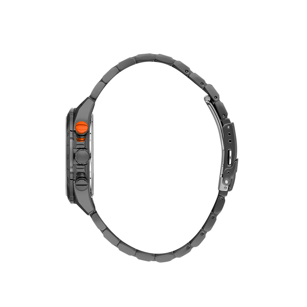 Carcasa rotunda de 42 mm este realizata din aliaj metalic durabil, finisata intr-o nuanta sofisticata de antracit, completata armonios de bratara din otel inoxidabil de aceeasi culoare. Geamul din cristal mineral protejeaza eficient cadranul, oferind rezistenta sporita la zgarieturi si uzura zilnica.
