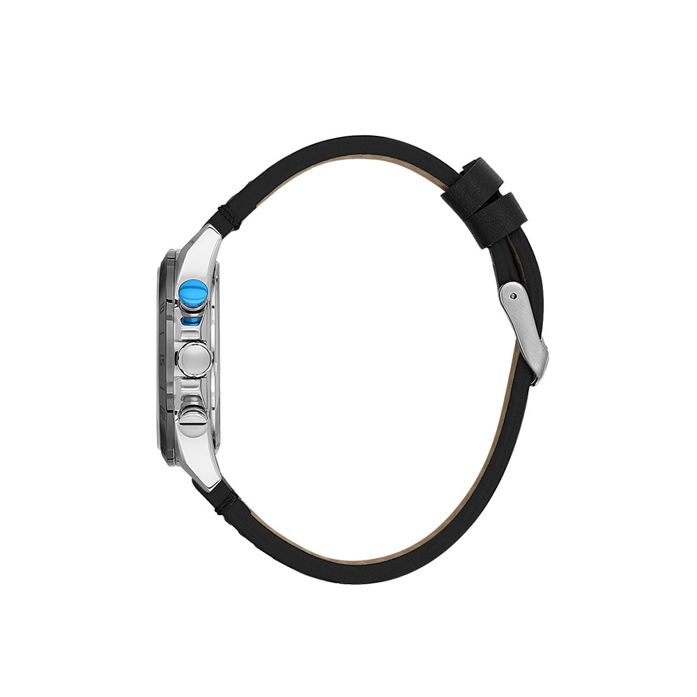 Carcasa rotunda, cu un diametru de 45 mm si o grosime de 12 mm, este realizata din aliaj metalic finisat in culoare antracit, oferind un aspect solid si modern. Cadranul negru este completat de accente alb-argintii si albastre, evidentiind functiile multiple precum afisajul Dual Time, formatul 12/24 ore, data si ziua saptamanii. Toate acestea sunt protejate de un geam din cristal mineral, rezistent la zgarieturi si uzura.