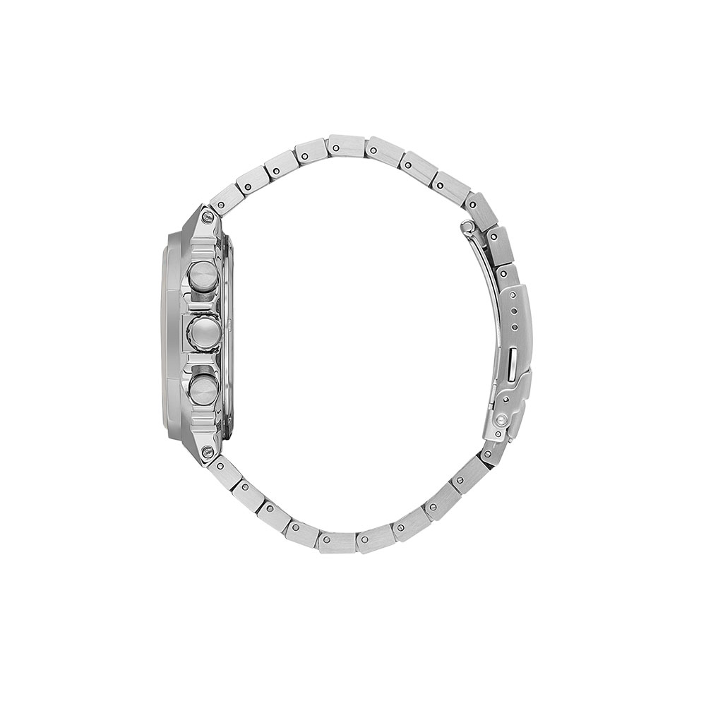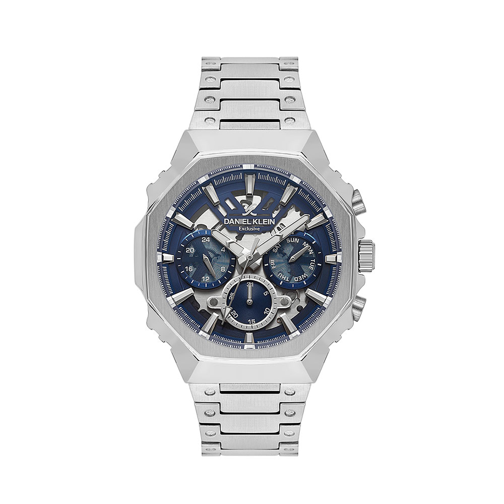 Carcasa octogonala din aliaj metalic argintiu si bratara robusta din otel inoxidabil confera ceasului un aspect puternic si masculin. Cadranul bleumarin, cu afisaj analogic si marcaje metalice, adauga profunzime vizuala si contrast elegant.