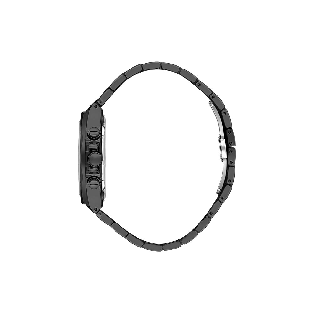Carcasa rotunda din aliaj metalic negru cu diametru de 41 mm si grosime de 11 mm se armonizeaza perfect cu bratara din otel inoxidabil negru, oferind un aspect robust si sofisticat. Cadranul in nuanta albastru petrol este accentuat de detalii in tonuri auriu rose, creand un contrast vizual placut si usor de citit.