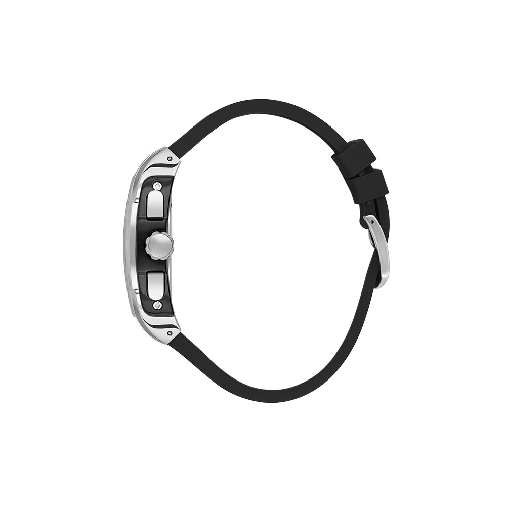Bratara din silicon negru de 25 mm latime asigura confort pe durata intregii zile, iar sistemul de inchidere cu catarama garanteaza o fixare sigura. Geamul din cristal mineral protejeaza eficient mecanismul quartz japonez Miyota JP15, cu o abatere de ±20 secunde/luna.