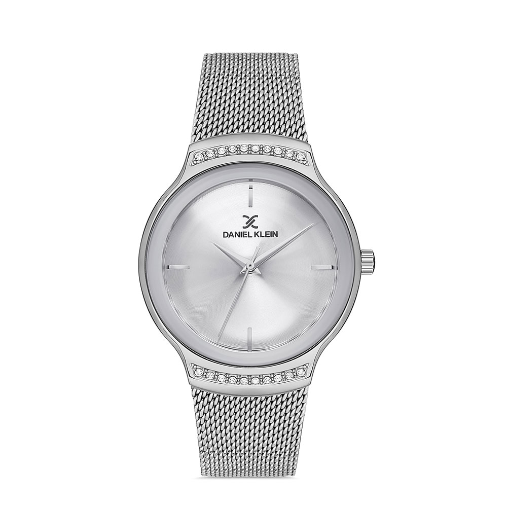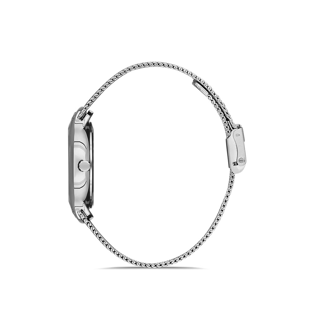 Carcasa decorata cu zirconii albe; bratara tip mesh, cu inchizatoare reglabila.
