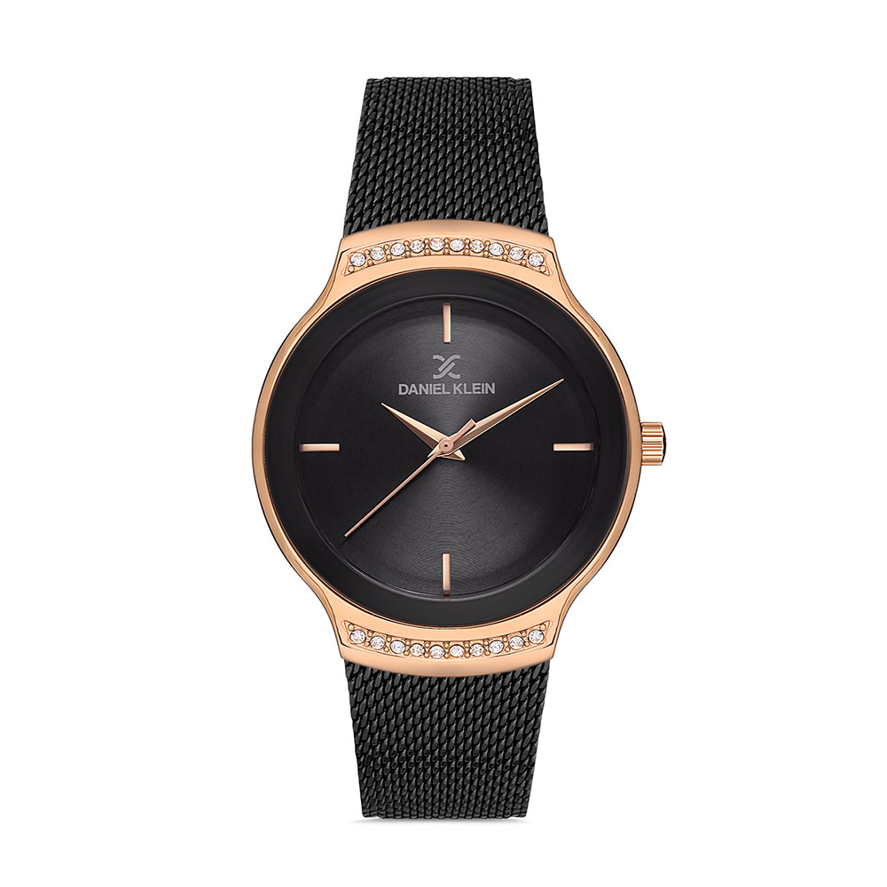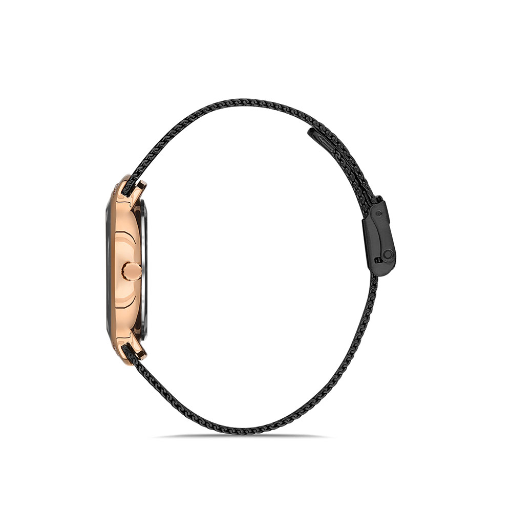 Carcasa decorata cu zirconii albe; bratara tip mesh, cu inchizatoare reglabila.