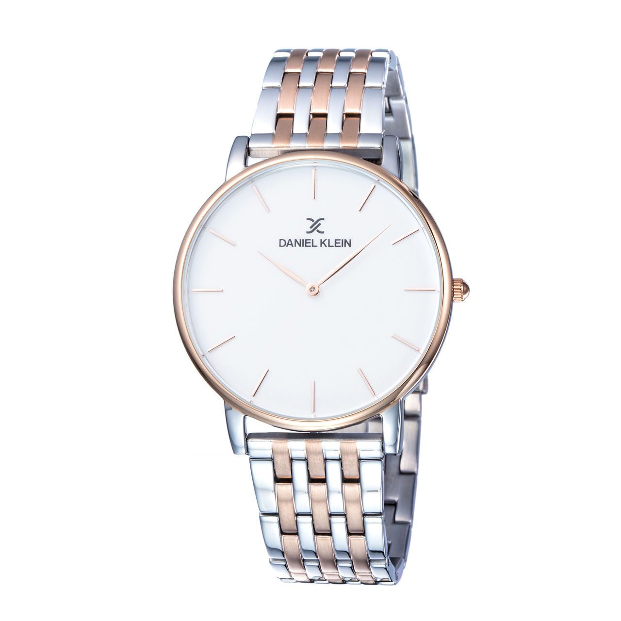 Cadran argintiu cu bezel auriu rose; bratara zale in doua culori argintiu si auriu rose; fara indicator secunde.