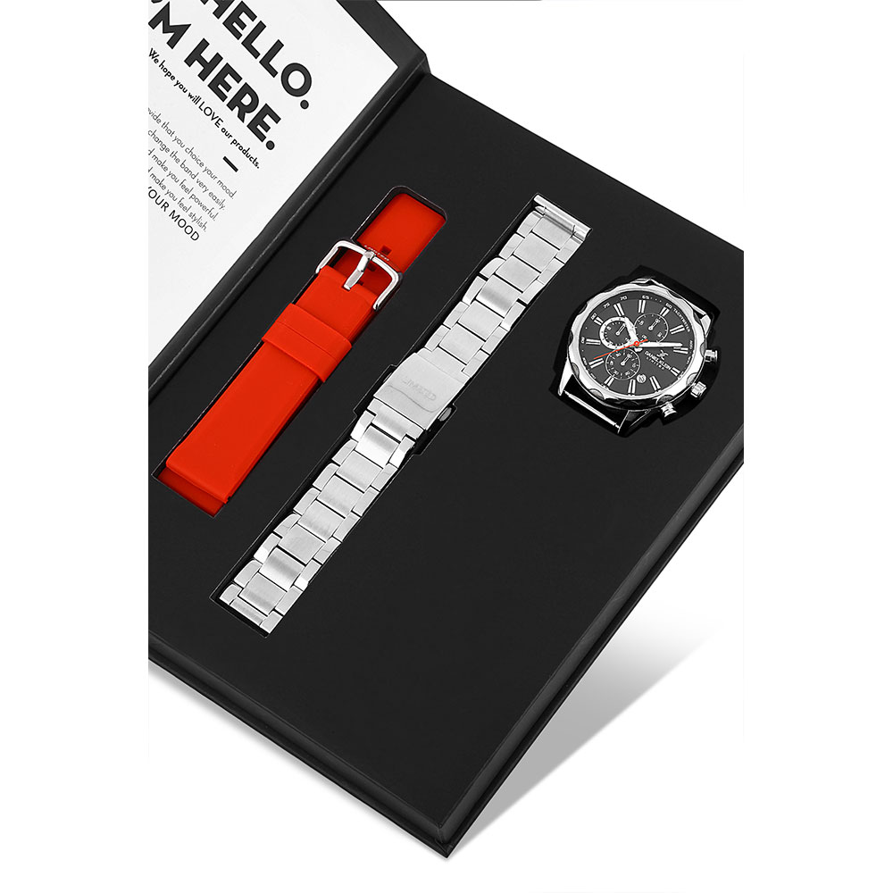 Ceasul este ambalat in cutie personalizata, avand o curea rosie din silicon ca rezerva, cu lungimea utila de 22 cm; indicatoare luminoase; carcasa argintie cu bezel decorativ negru; bratara tip zale, in doua tonuri, argintiu mat si lucios, cu inchizatoare tip fluture, avand lungimea utila de 21 cm; afiseaza data curenta; functie cronometru; atat bratara cat si cureaua nu sunt montate pe ceas, acest lucru putand fi facut foarte usor, cu ajutorul telescoapelor detasabile.