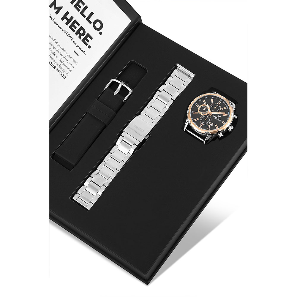 Ceasul este ambalat in cutie personalizata, avand o curea neagra din silicon ca rezerva, cu lungimea utila de 22 cm; indicatoare luminoase; carcasa argintie cu bezel decorativ auriu rose; bratara tip zale, in doua tonuri, argintiu mat si lucios, cu inchizatoare tip fluture, avand lungimea utila de 21 cm; afiseaza data curenta; functie cronometru; atat bratara cat si cureaua nu sunt montate pe ceas, acest lucru putand fi facut foarte usor, cu ajutorul telescoapelor detasabile.