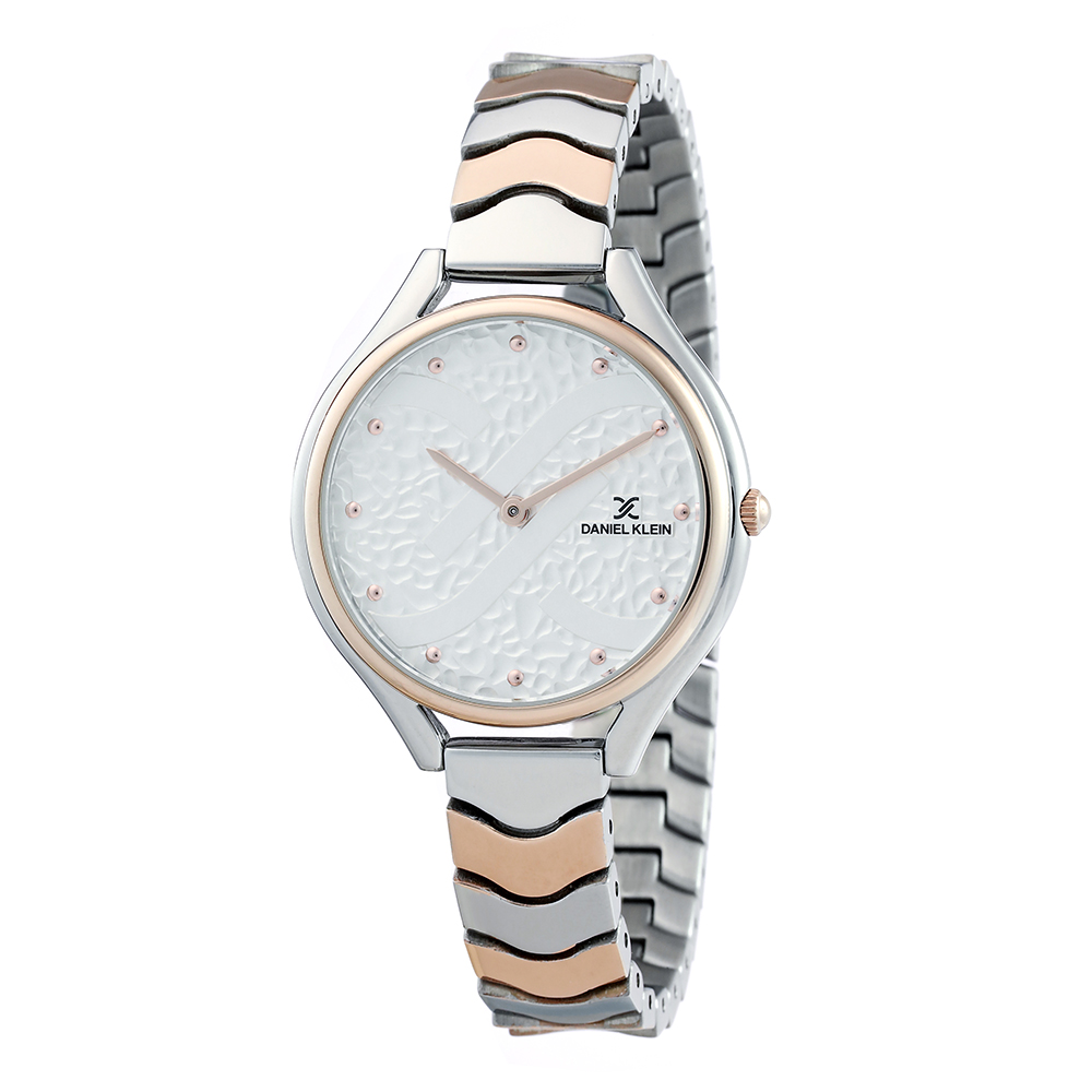 Carcasa argintie cu bezel decorativ auriu rose; bratara tip zale, in doua culori, argintiu si auriu rose, cu inchizatoare tip bijuterie; fara indicator secunde.