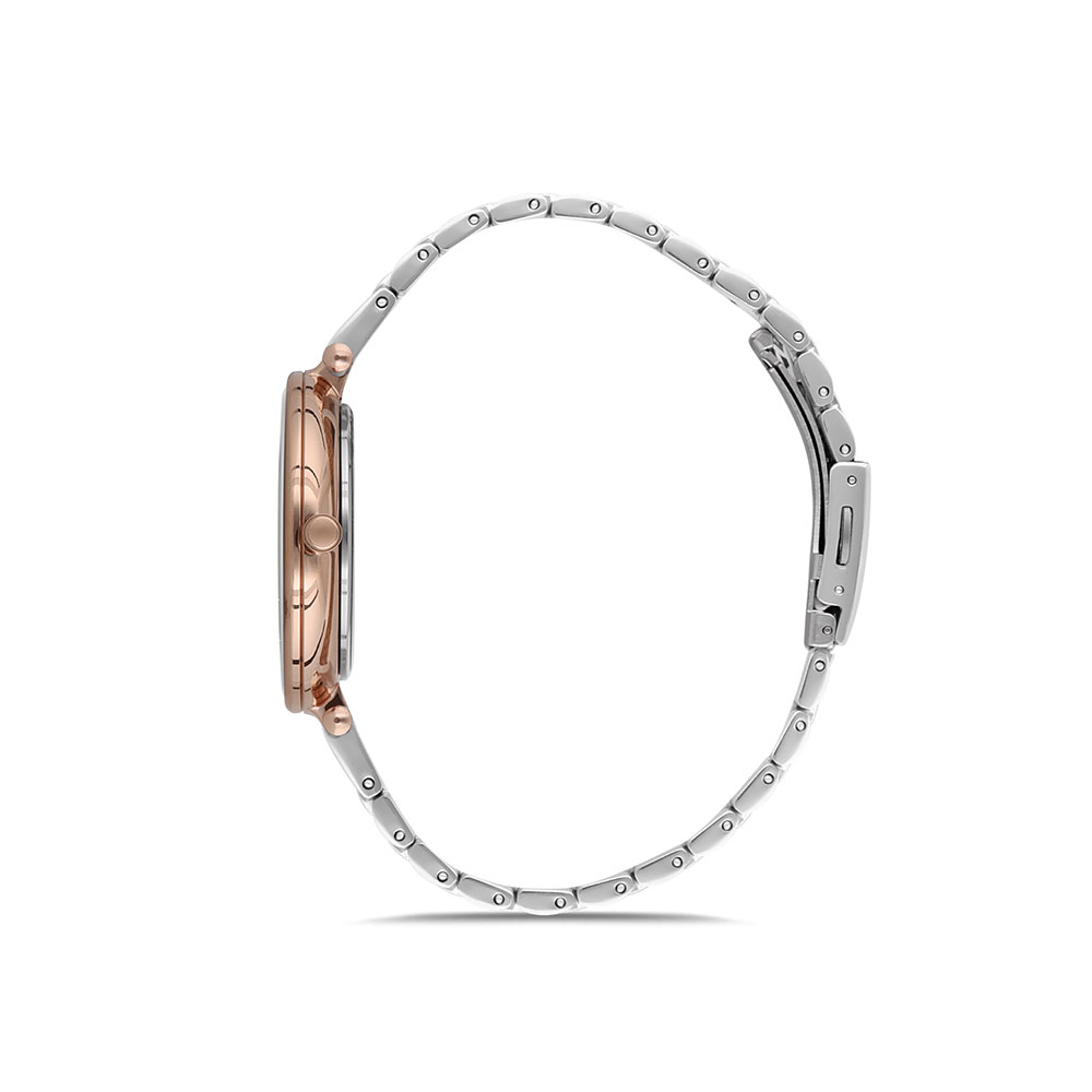 Cadran decorat cu pudra de zirconii si simbolul marcii; indicatoare luminoase; bratara tip zale, in doua culori, argintiu si auriu rose, cu inchizatoare tip fluture.