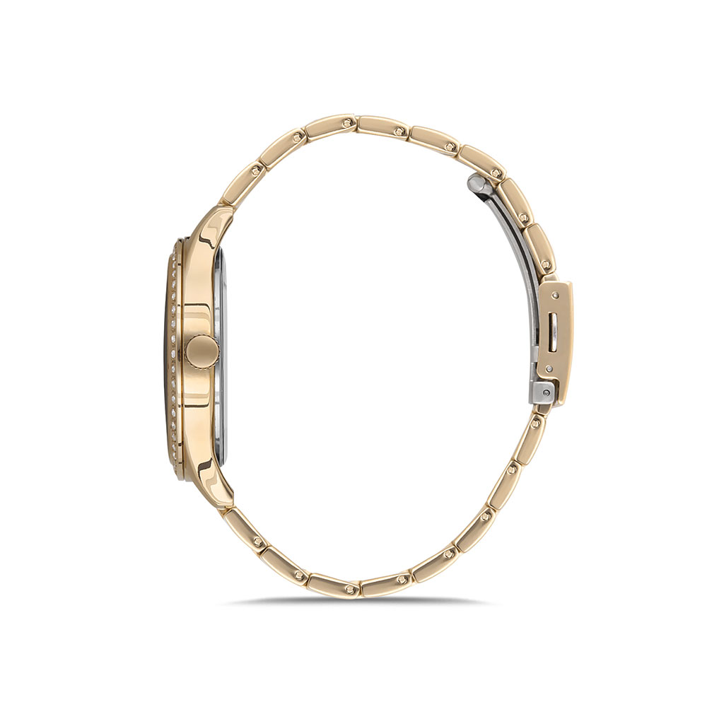 Cadran decorat cu pudra de zirconii si zirconii albe; carcasa decorata cu zirconii albe; bratara tip zale, cu inchizatoare tip fluture.