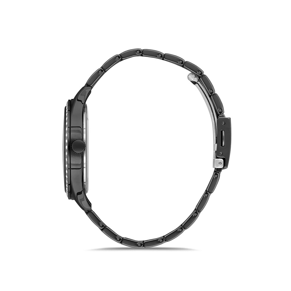 Cadran decorat cu pudra de zirconii si zirconii albe; carcasa decorata cu zirconii albe; bratara tip zale, cu inchizatoare tip fluture.