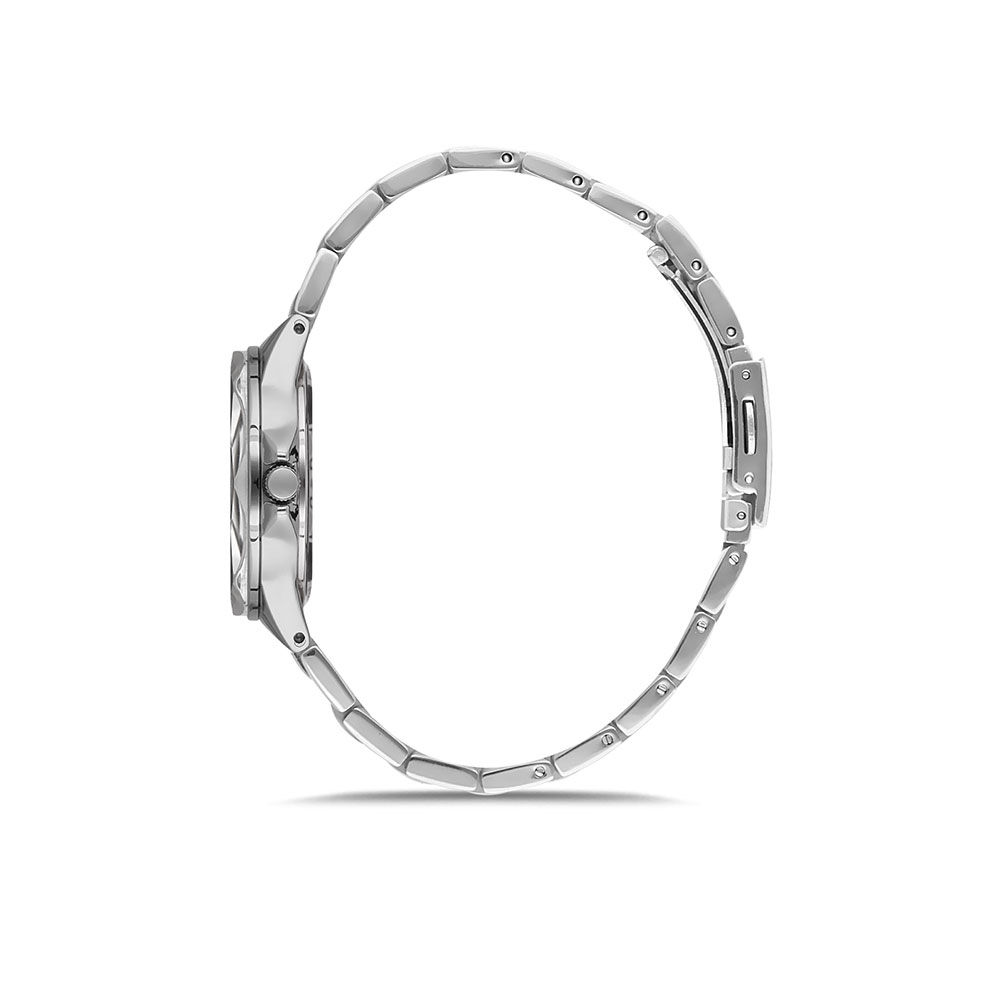 Cadran cu efect de oglinda; geam fatetat; bratara tip zale, in doua culori, argintiu si auriu rose, cu inchizatoare tip fluture.