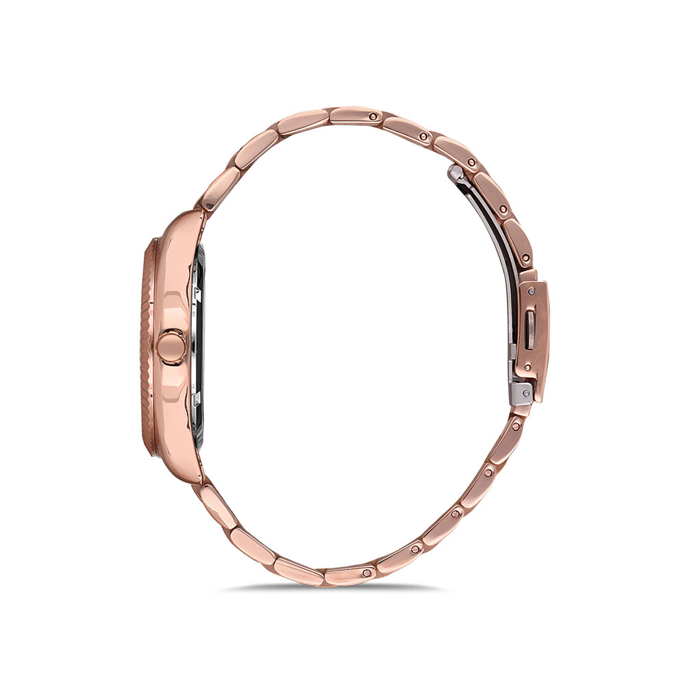 Cadran decorat cu zirconii albe; indicatoare luminoase; bratara tip zale, cu inchizatoare tip fluture.