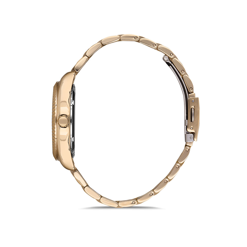 Cadran decorat cu zirconii albe; indicatoare luminoase; bratara tip zale, cu inchizatoare tip fluture.