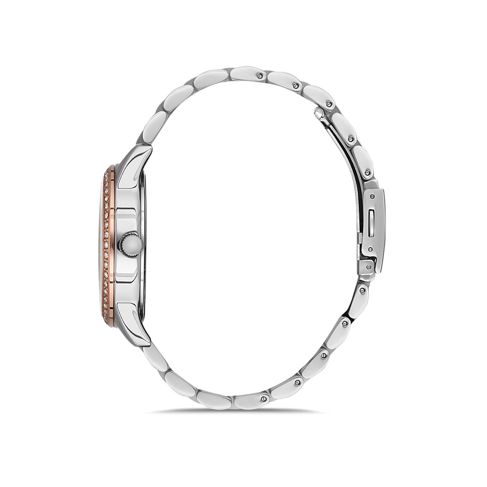 Cadran decorat cu zirconii albe; carcasa argintie, cu bezel decorativ auriu rose si zirconii albe; bratara tip zale, in doua culori, argintiu si auriu rose, cu inchizatoare tip fluture.