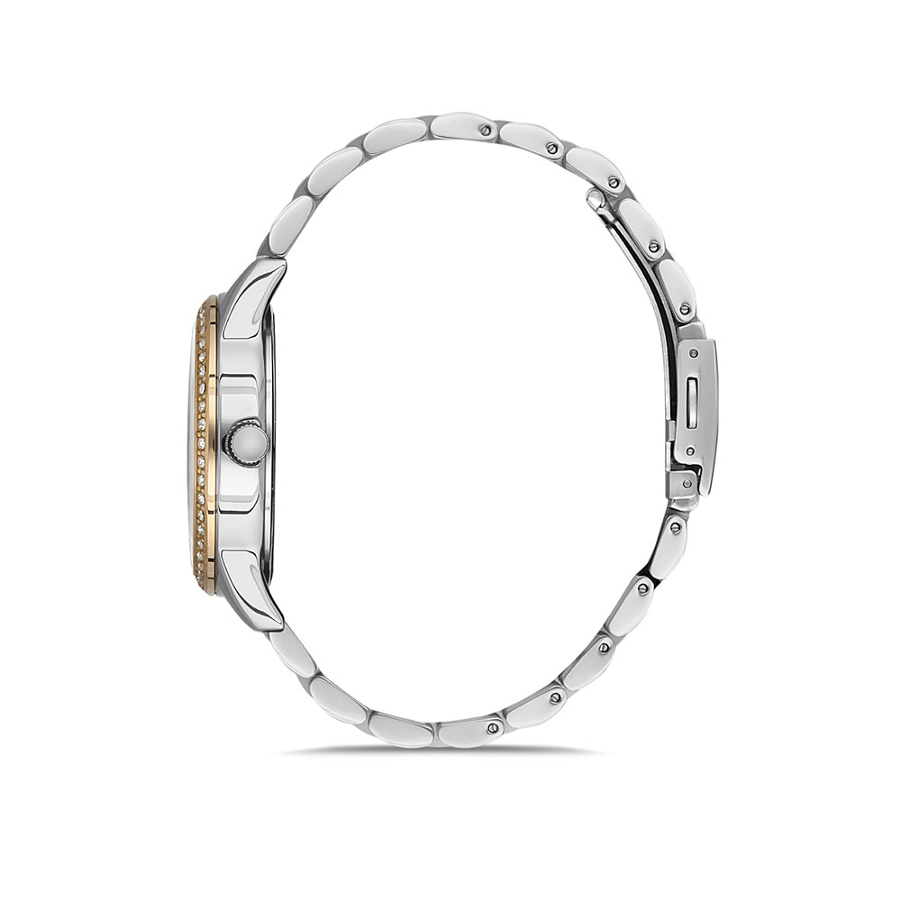 Cadran decorat cu zirconii albe; carcasa argintie, cu bezel decorativ auriu si zirconii albe; bratara tip zale, in doua culori, argintiu si auriu, cu inchizatoare tip fluture.