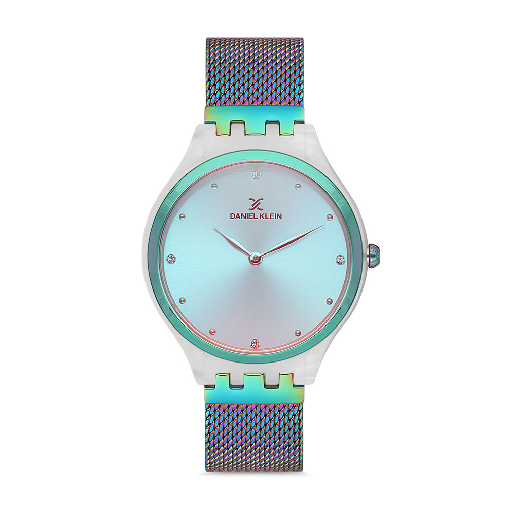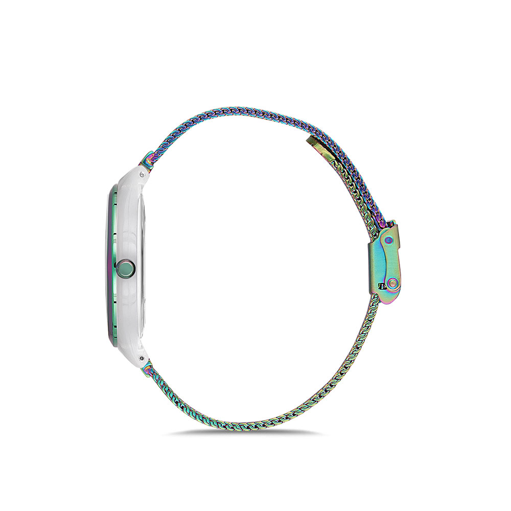 Cadran decorat cu zirconii albe; geam cu suprafata antireflex; carcasa cu suport din plastic; bratara tip mesh, cu inchizatoare reglabila.