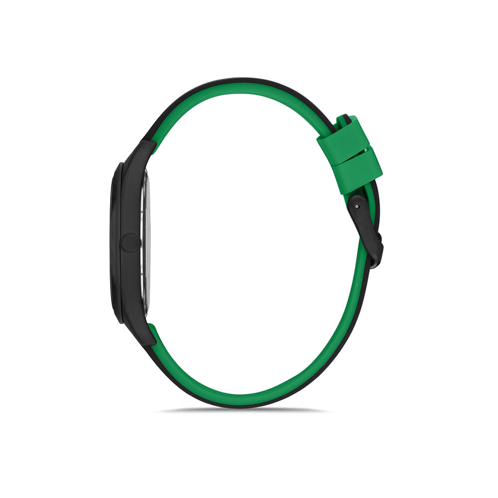 Carcasa rotunda de 41 mm este realizata din aliaj metalic durabil, avand o eleganta nuanta neagra, ce completeaza perfect cureaua din silicon negru-verde. Acest contrast cromatic adauga un plus de personalitate si dinamism designului. Sistemul de inchidere cu catarama ofera siguranta si confort la purtare.