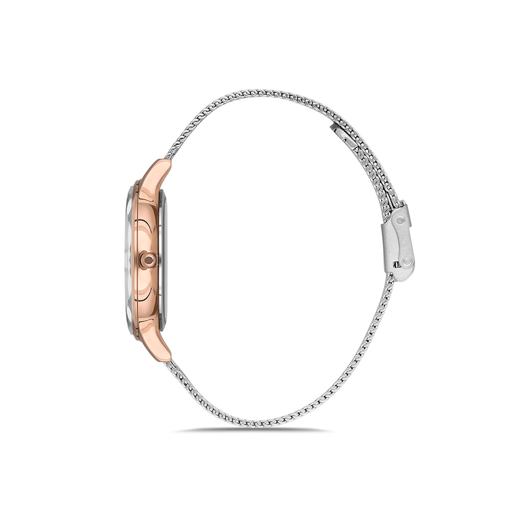 Cadran decorat cu zirconii albe; geam fatetat; bratara tip mesh cu inchizatoare reglabila, avand lungimea utila 20 cm si latimea de 1.6 cm; fara indicator secunde.