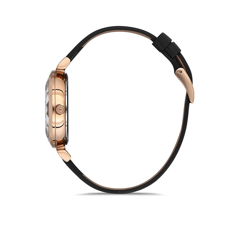 Cadran decorat cu pudra de zirconii; geam fatetat; curea cu lungimea utila 19 cm si latimea de 1.3 cm.