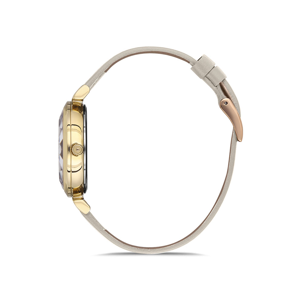 Cadran decorat cu pudra de zirconii; geam fatetat; curea cu lungimea utila 19 cm si latimea de 1.3 cm.