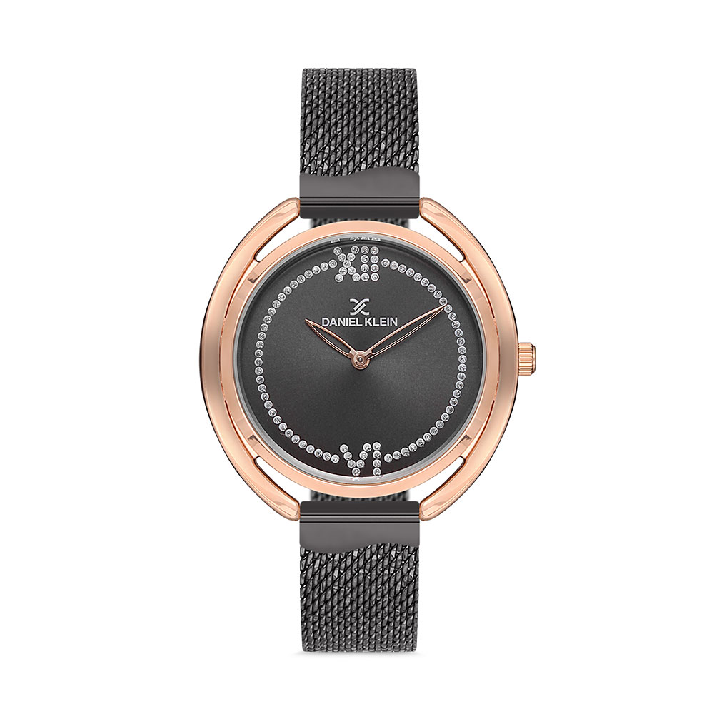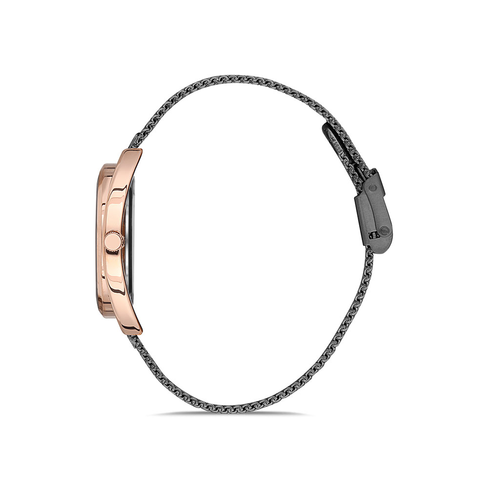 Cadran decorat cu zirconii albe; bratara tip mesh cu inchizatoare reglabila, avand lungimea utila 19 cm si latimea de 1.5 cm.