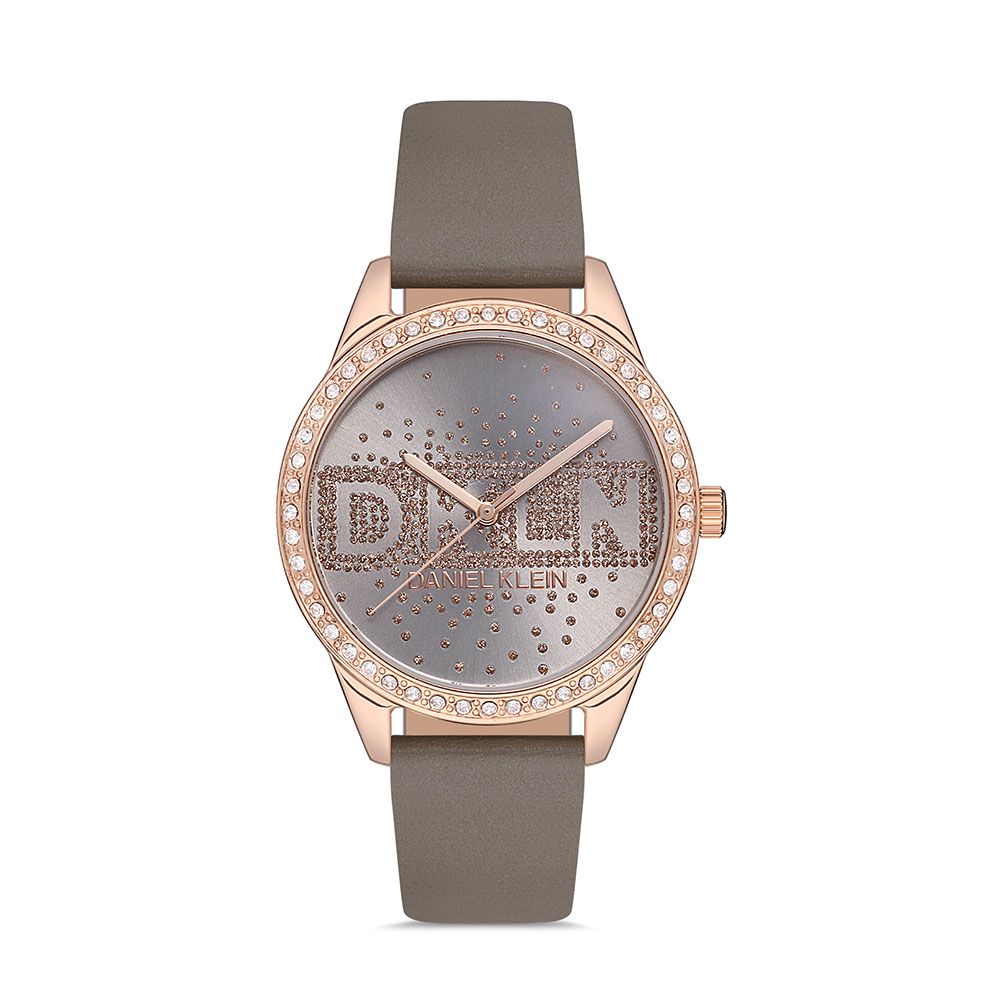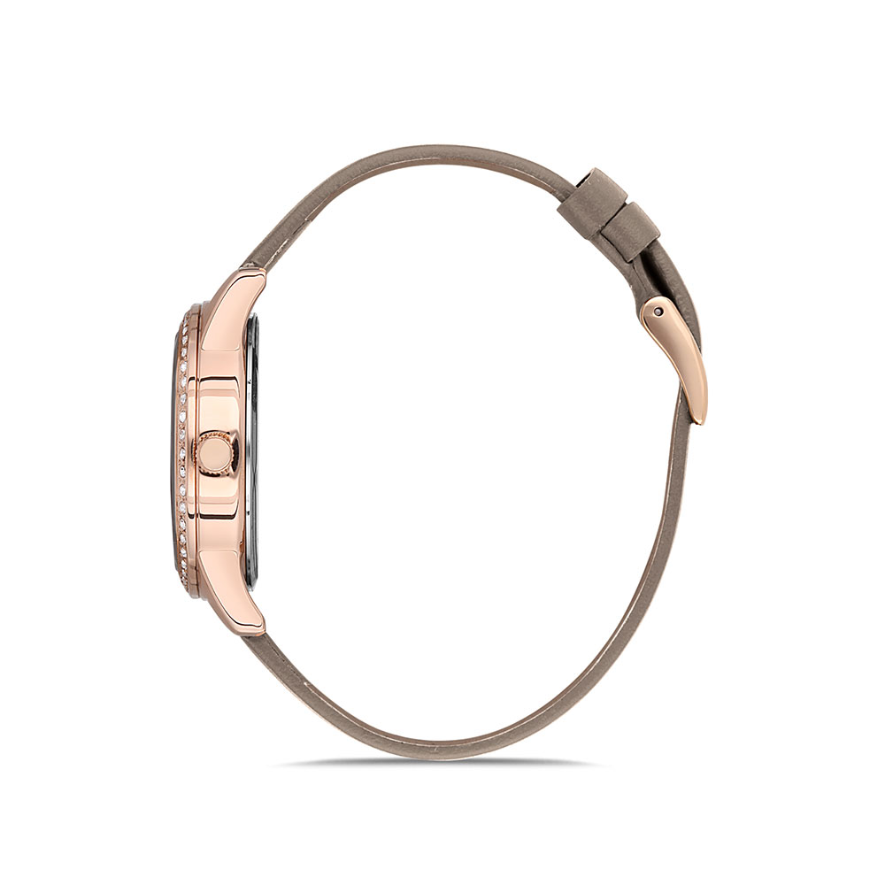 Carcasa rotunda de 36 mm este realizata din aliaj metalic si finisata intr-o nuanta de auriu rose, oferind un aspect sofisticat. Cadranul grej este decorat cu zirconii stralucitoare, evidentiind sigla brandului intr-un mod elegant. Rama carcasei este, de asemenea, impodobita cu cristale, adaugand un plus de rafinament.