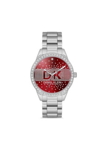 Cadranul rotund, de un burgund intens, este decorat cu un model spectaculos de cristale stralucitoare, punand in valoare sigla brandului Daniel Klein. Conturul acestuia este accentuat de o carcasa argintie din aliaj metalic, ce adauga un plus de eleganta.