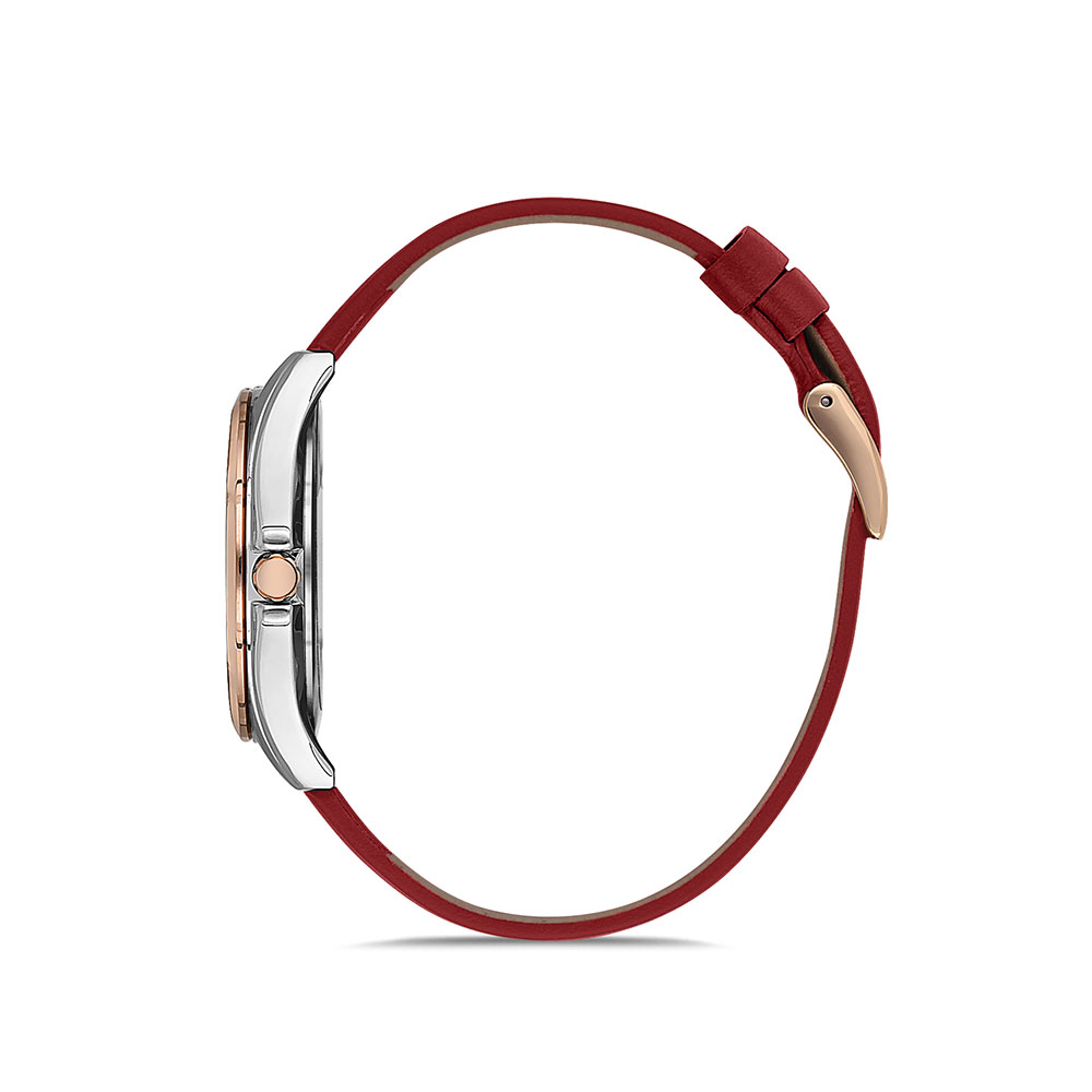Cadran decorat cu zirconii albe; indicatoare luminoase; carcasa argintie cu bezel decorativ auriu rose; curea cu lungimea utila 19.5 cm si latimea de 1.6 cm.