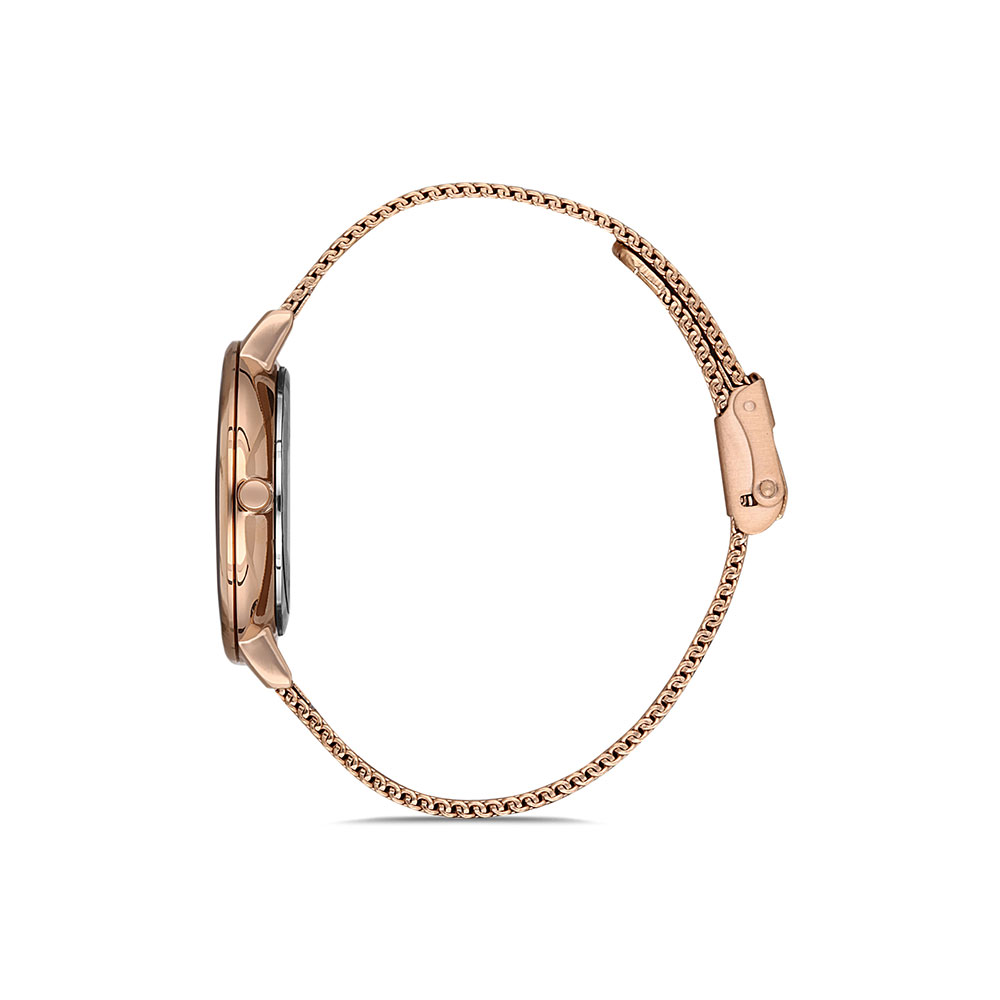 Cadran cu efect de oglinda; bratara tip mesh cu inchizatoare reglabila, avand lungimea utila de 19 cm; fara indicator secunde.