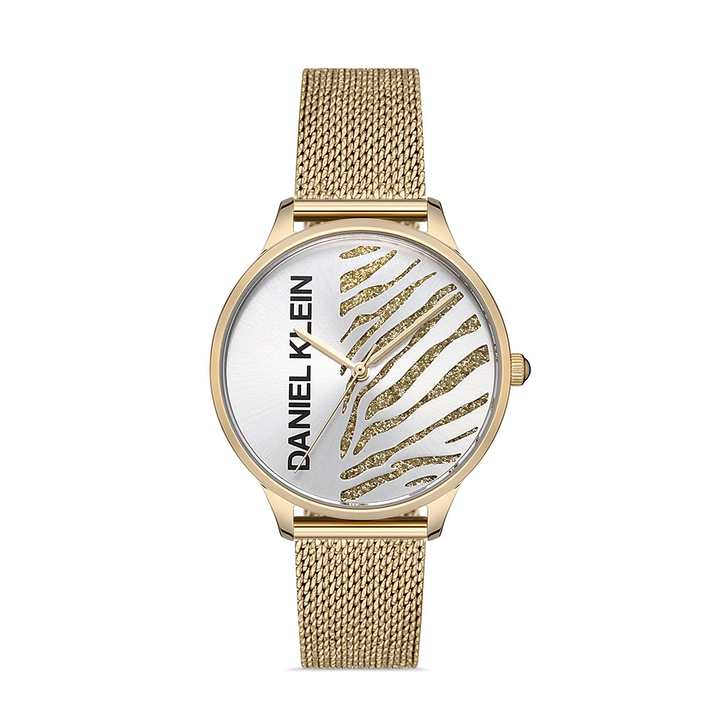 Cadranul argintiu este decorat cu un model inspirat de imprimeul animal print, realizat din insertii stralucitoare aurii, oferind un efect vizual unic. Carcasa rotunda aurie, cu un diametru de 36 mm si o grosime de 9 mm, completeaza perfect aspectul luxos al acestui ceas.