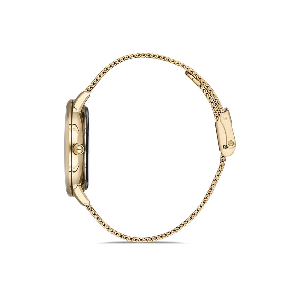 Bratara din otel inoxidabil, cu finisaj auriu si impletitura tip mesh, asigura un confort sporit si o fixare sigura datorita sistemului de inchidere reglabil.