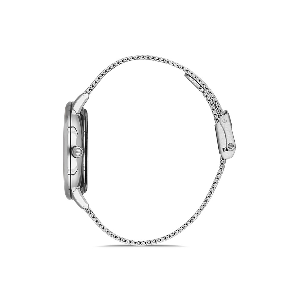 Cadran decorat animal print; bratara tip mesh cu inchizatoare reglabila, avand lungimea utila de 19 cm; fara indicator secunde.