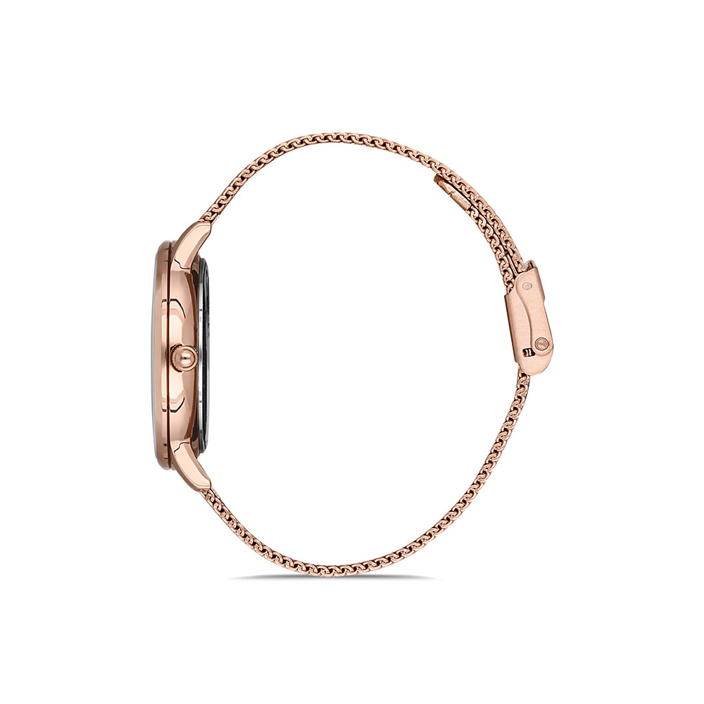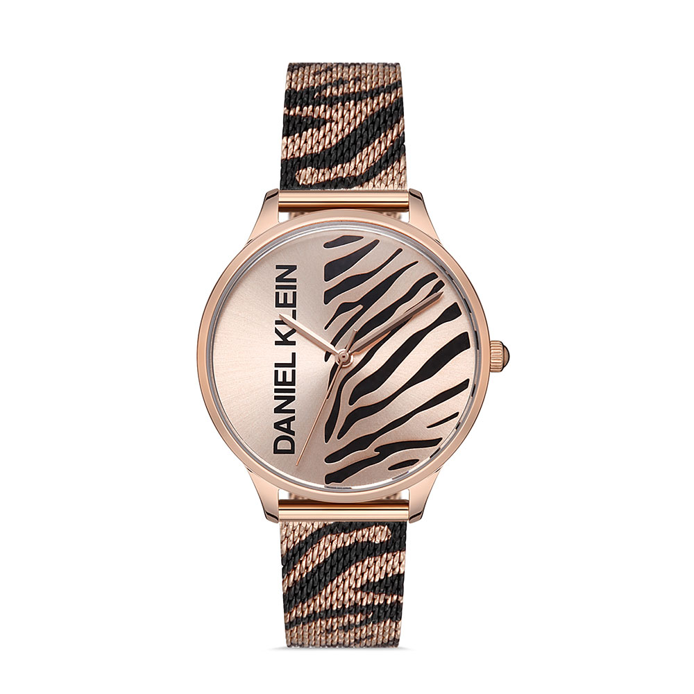 Cadran decorat animal print; bratara tip mesh cu inchizatoare reglabila, avand lungimea utila de 19 cm; fara indicator secunde.