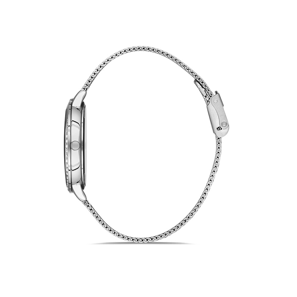 Cadran si carcasa decorate cu zirconii albe; bratara tip mesh cu inchizatoare reglabila, avand lungimea utila de 19 cm; fara indicator secunde.