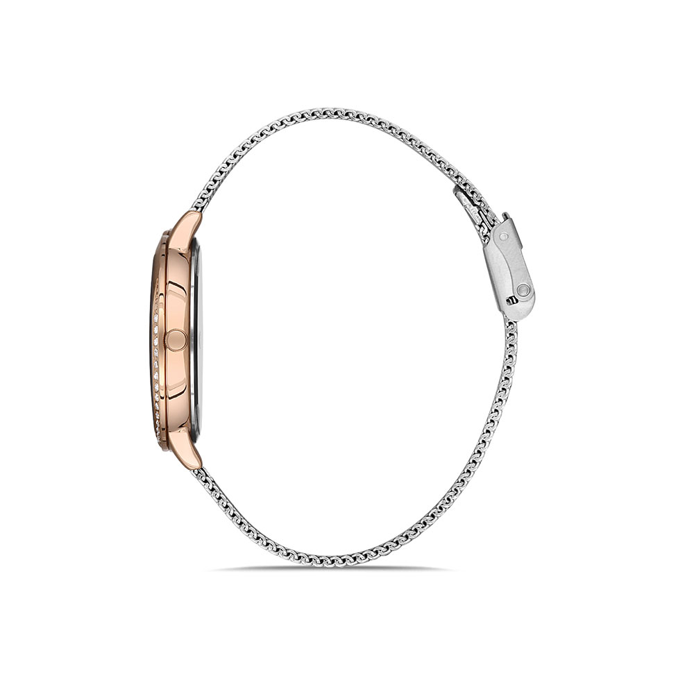Cadran si carcasa decorate cu zirconii albe; bratara tip mesh cu inchizatoare reglabila, avand lungimea utila de 19 cm; fara indicator secunde.