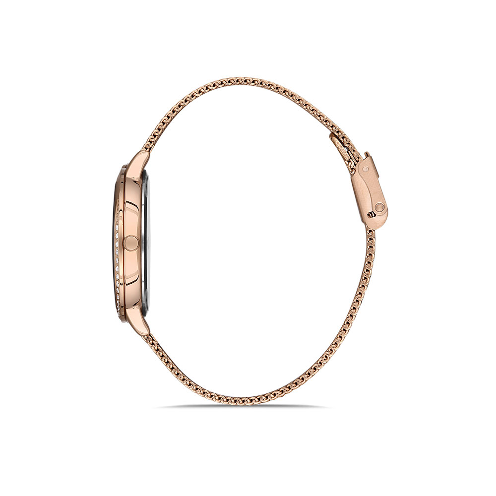 Cadran si carcasa decorate cu zirconii albe; bratara tip mesh cu inchizatoare reglabila, avand lungimea utila de 19 cm; fara indicator secunde.