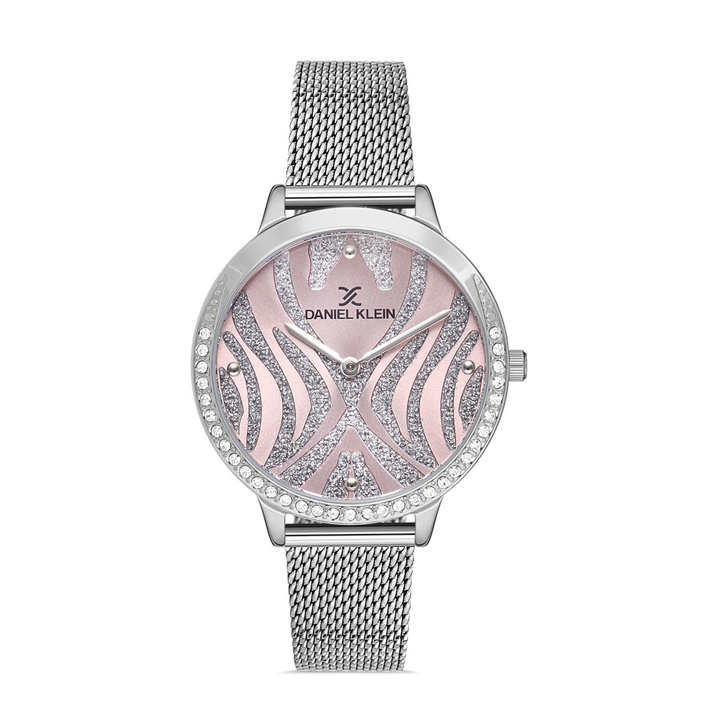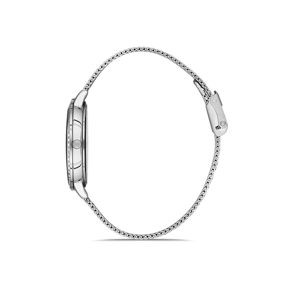 Cadran si carcasa decorate cu zirconii albe; bratara tip mesh cu inchizatoare reglabila, avand lungimea utila de 19 cm; fara indicator secunde.