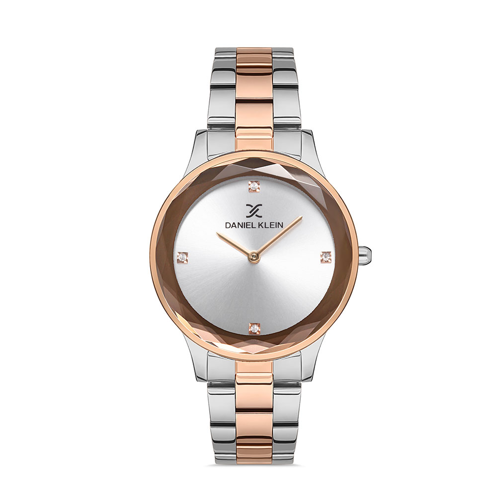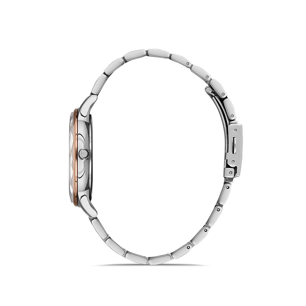 Cadran cu bezel fatetat; carcasa argintie cu bezel decorativ auriu rose; bratara tip zale, in doua culori, argintiu si auriu rose, cu inchizatoare tip fluture; fara indicator secunde.