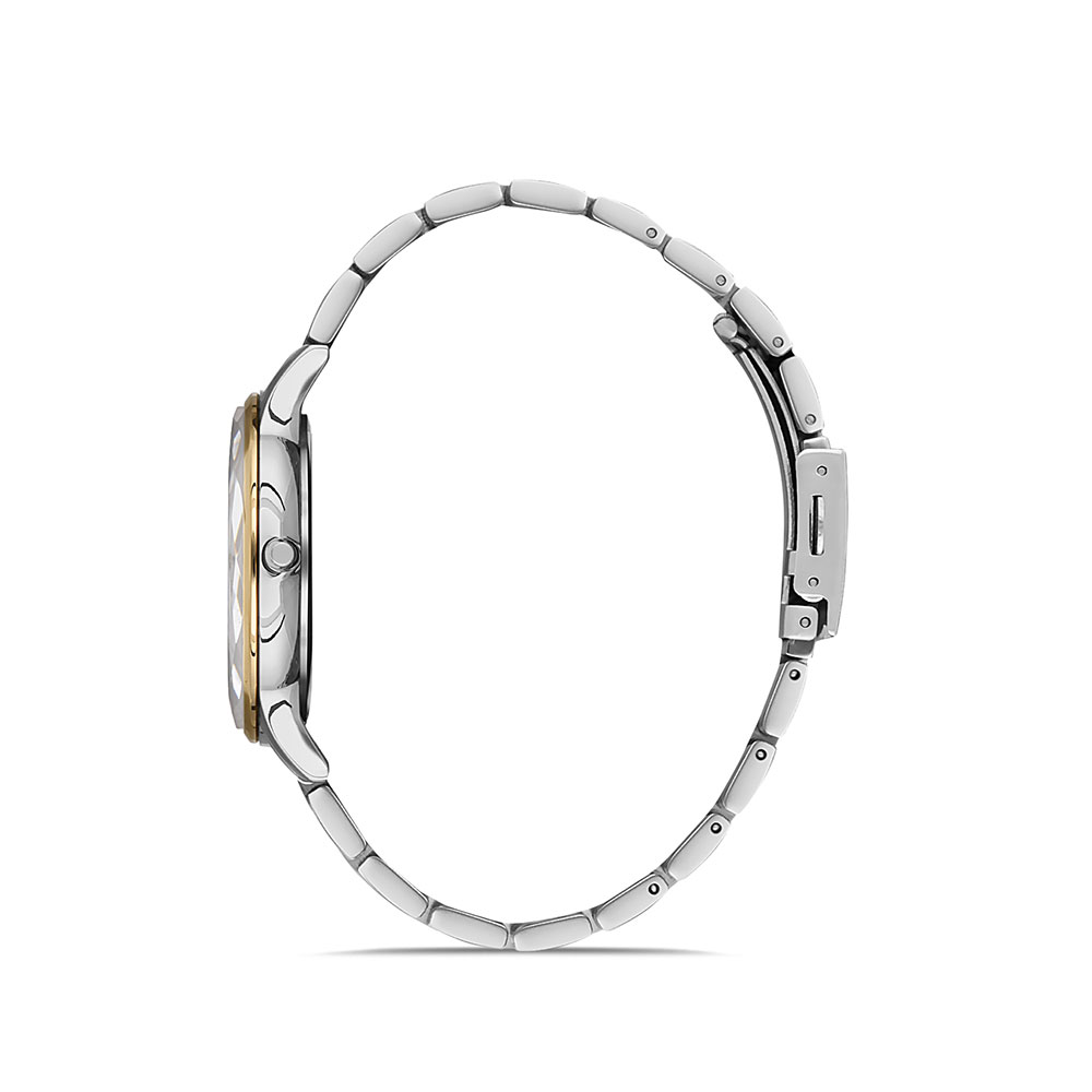 Cadran cu bezel fatetat; carcasa argintie cu bezel decorativ auriu; bratara tip zale, in doua culori, argintiu si auriu, cu inchizatoare tip fluture; fara indicator secunde.