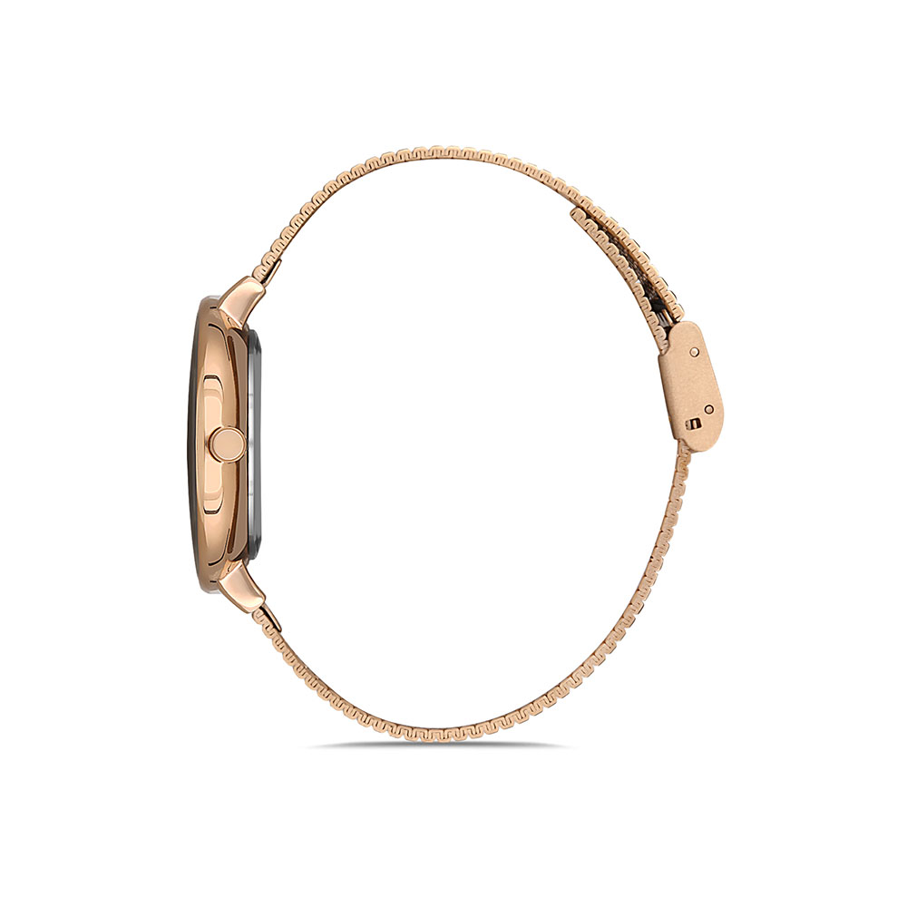 Cadran bicolor decorat cu zirconii albe; bratara tip zale, cu inchizatoare reglabila, o parte avand culoarea aurie rose, iar cealalta aramie; fara indicator secunde.